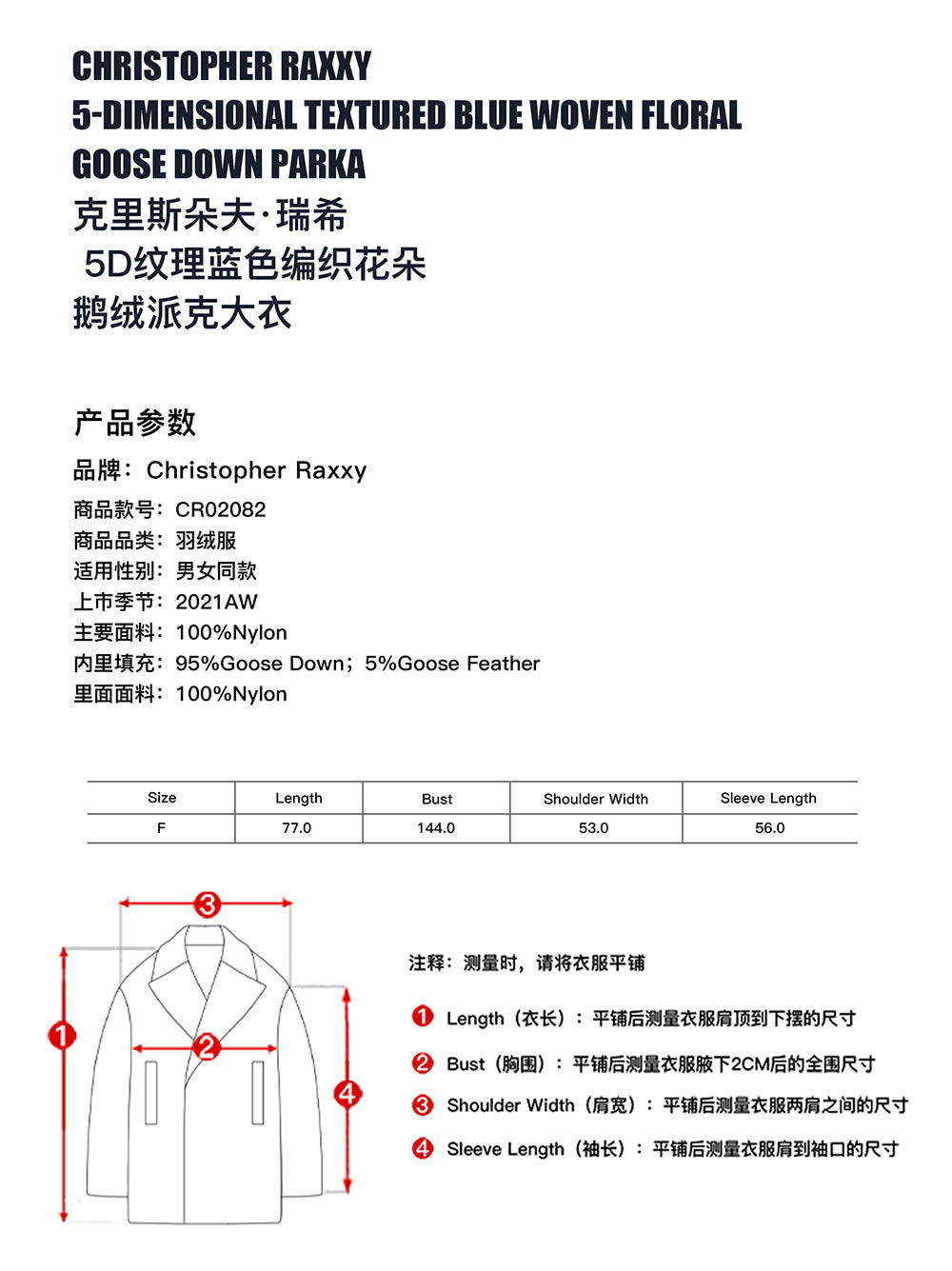 5-DIMENSIONAL TEXTURED BLUE WOVEN FLORAL GOOSE DOWN PARKA