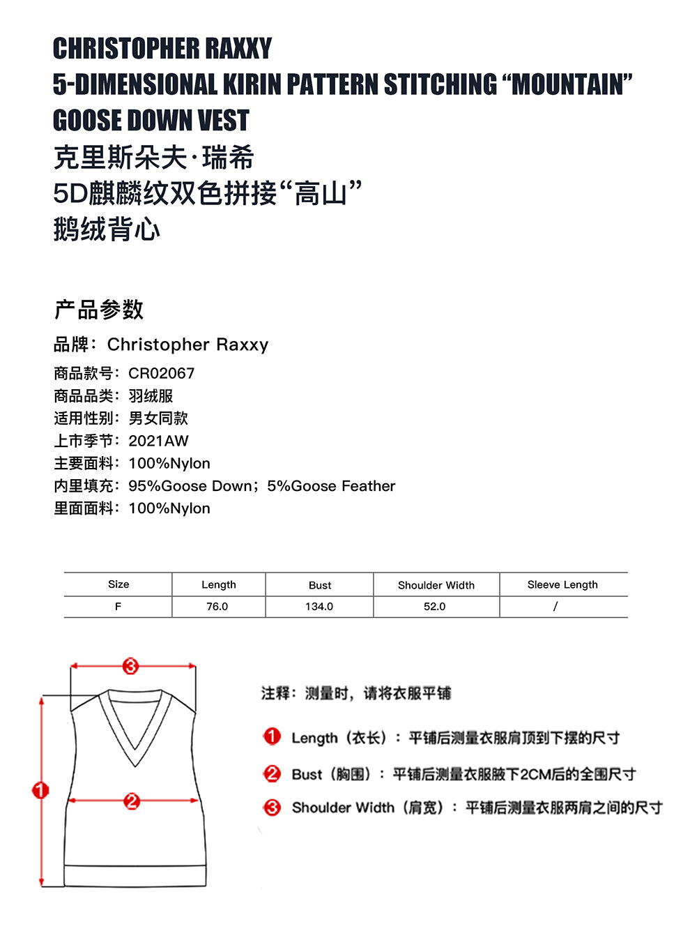 5-DIMENSIONAL KIRIN PATTERN STITCHING "MOUNTAIN" GOOSE DOWN VEST