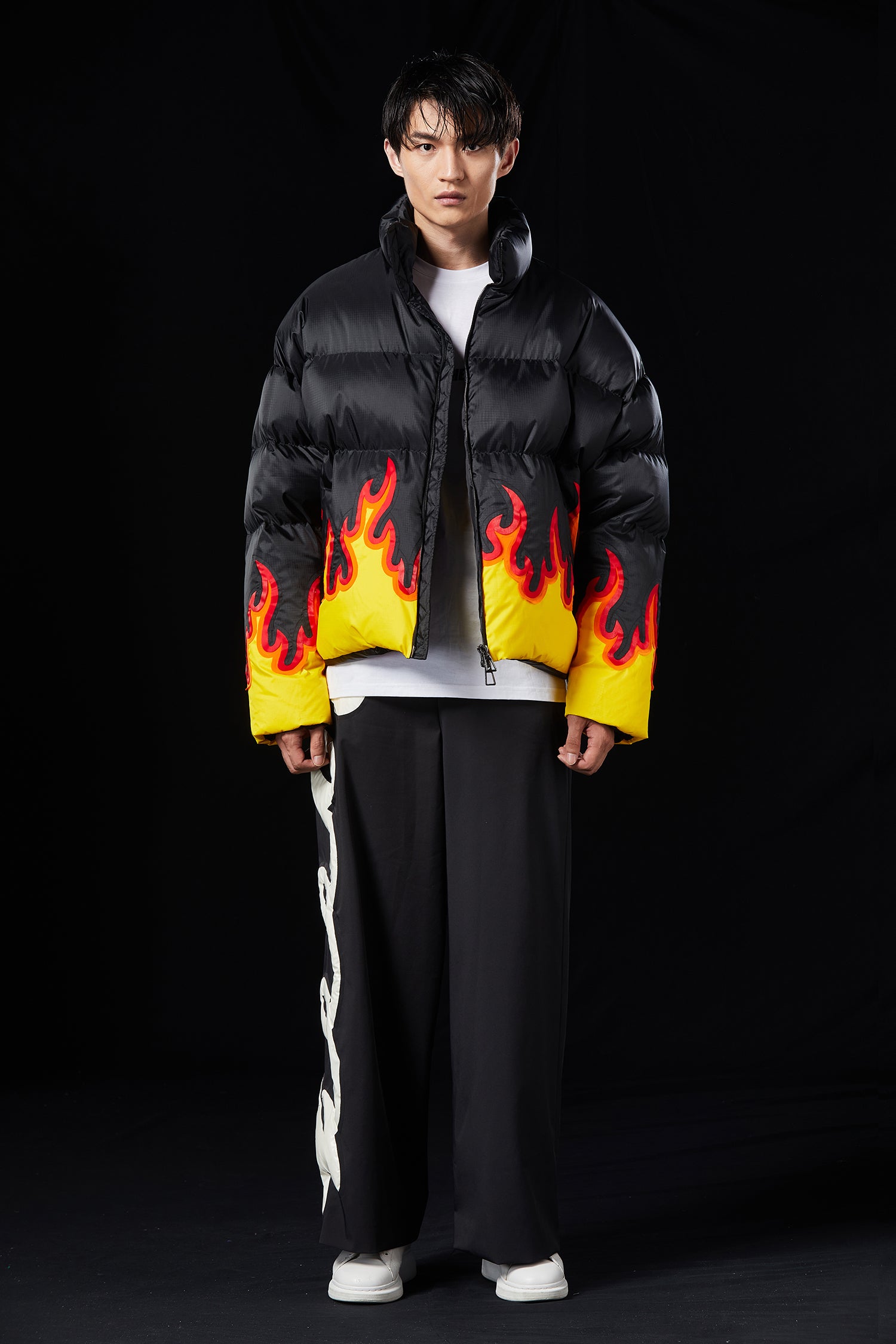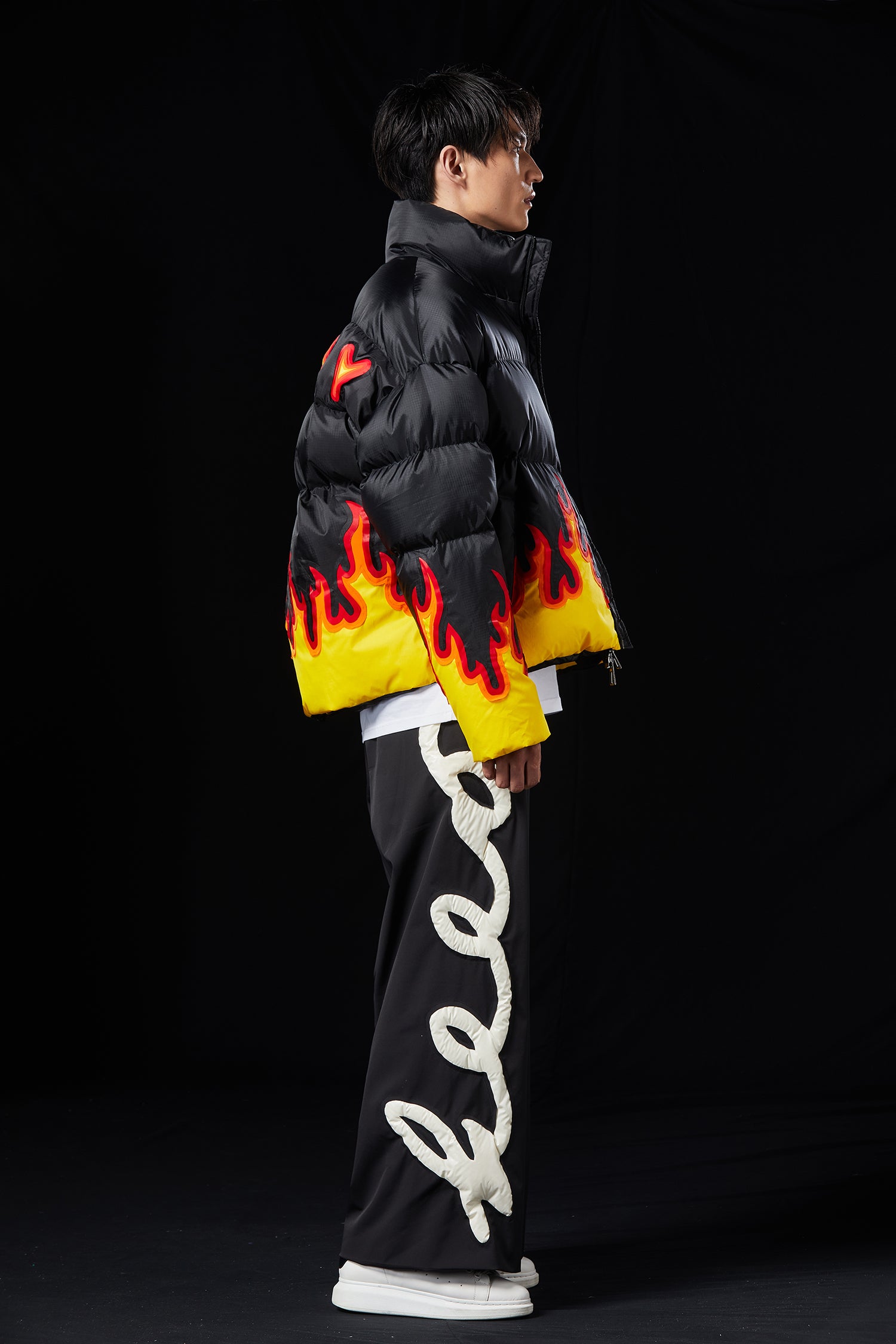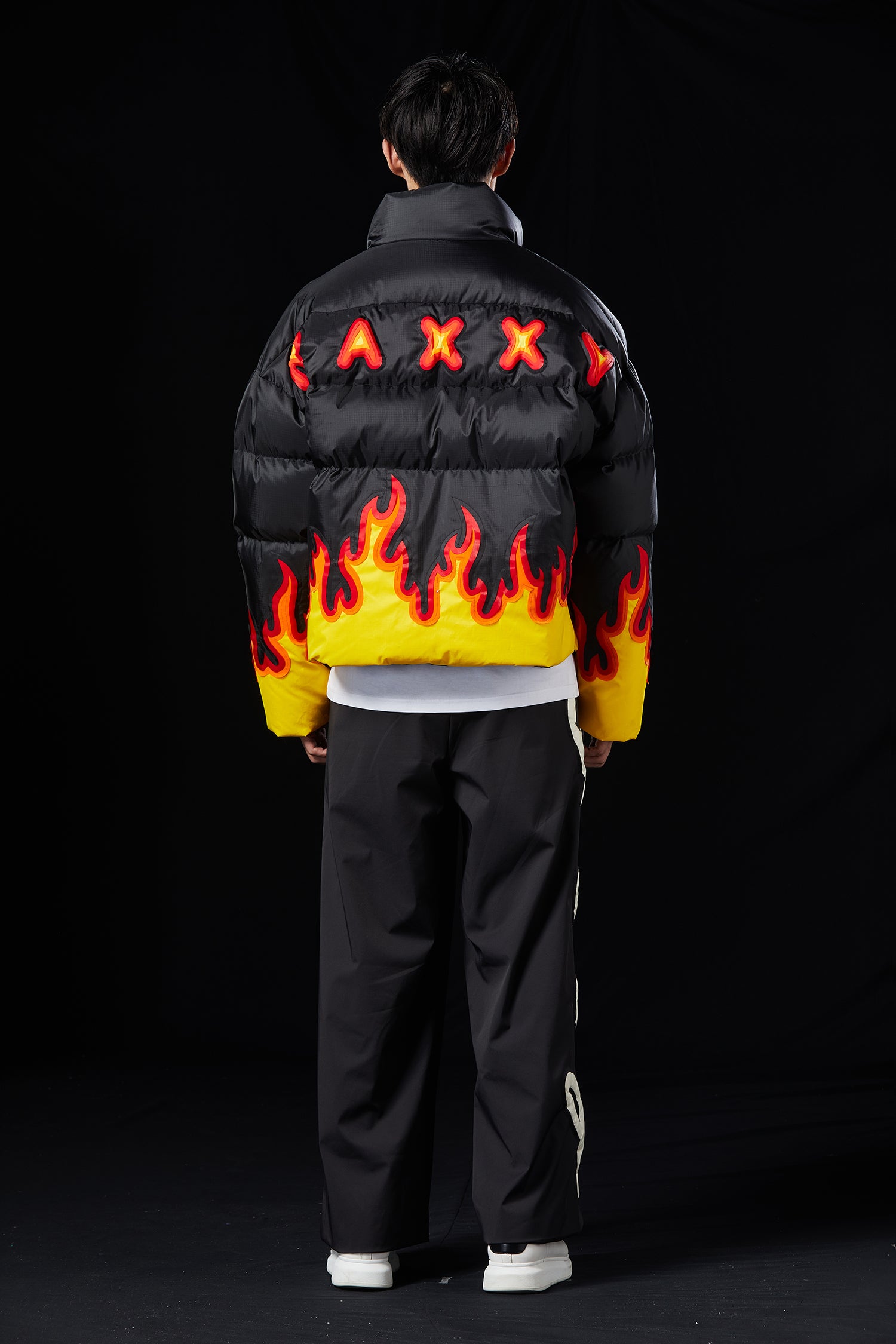 “BURNING" PAPER-CUT CRAFT FLAME SILHOUETTE GOOSE DOWN JACKET